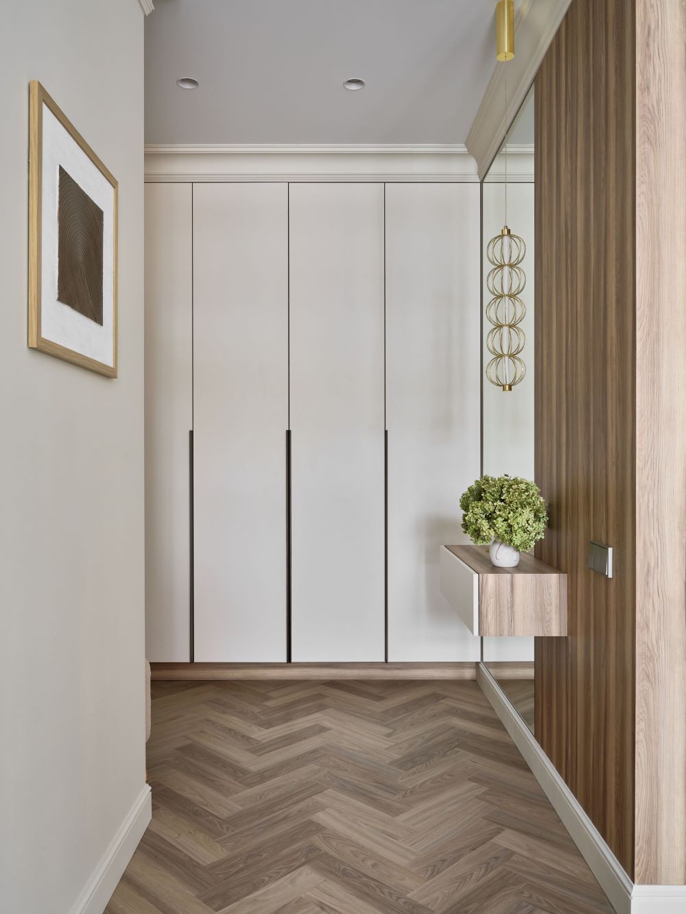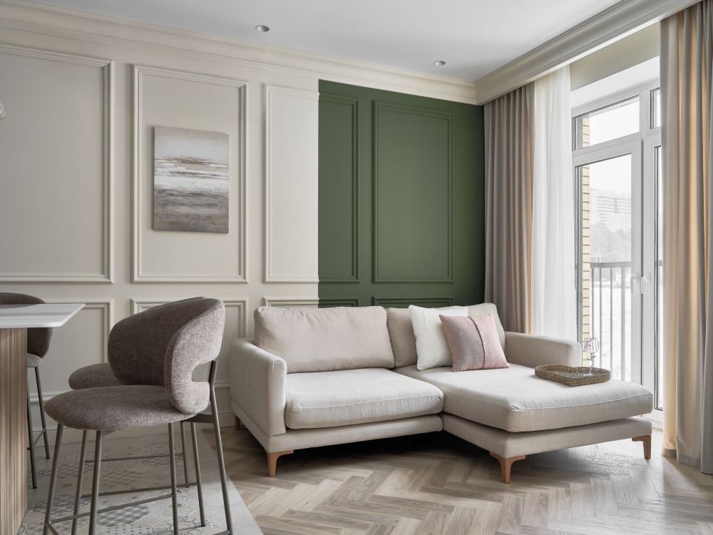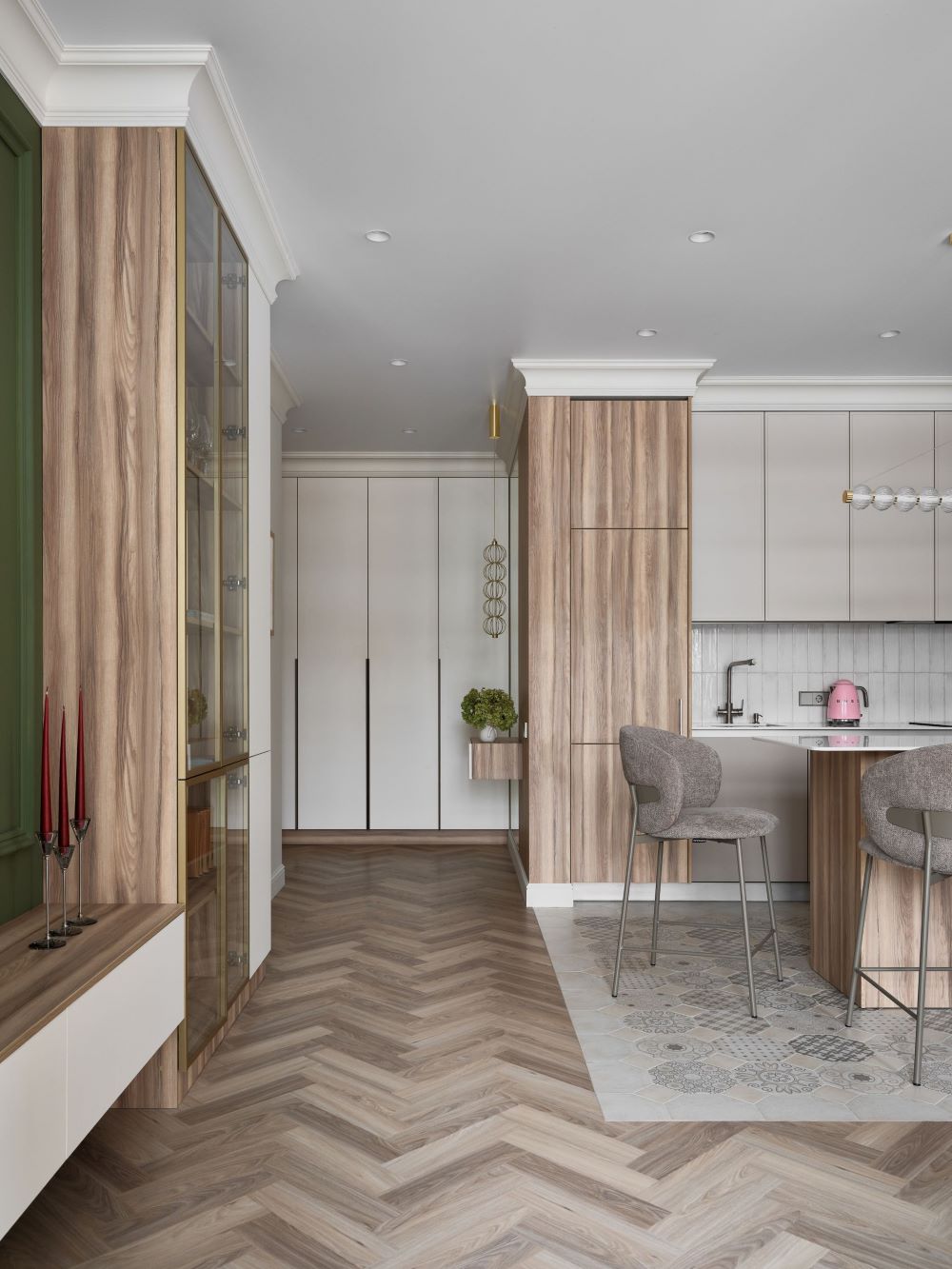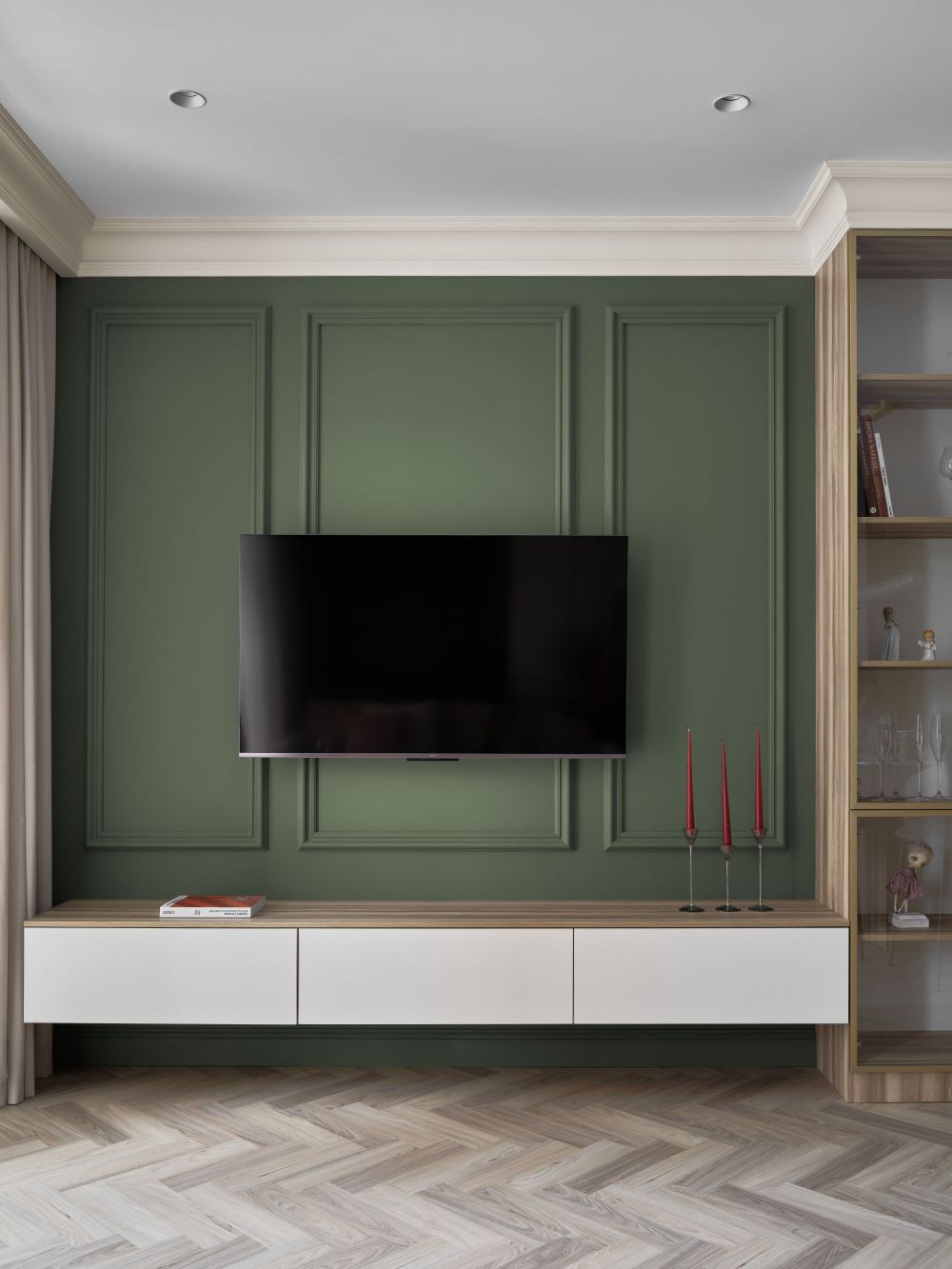 Классика этого интерьера читается в деталях — филёнках на стенах, широких карнизах и спокойной симметрии. Пространство звучит современно и легко, как продуманная композиция без лишних нот. Акцентная стена в цвете хаки добавляет интерьеру глубину и гармонично объединяется с тёплым деревом в отделке.